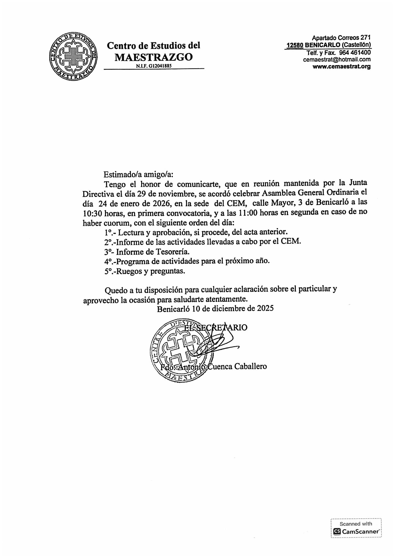 Benvolguts socis i sòcies. Us invitem a l’Assemblea General que se realitzarà en la seu del CEM, segons convocatòria adjunta, el dissabte 24 de gener de 2026. Tweet Share +1 Pinterest Email Compartir este artículo: Share on FacebookShare on Facebook TweetShare on Twitter Pin itShare on Pinterest Share on LinkedInShare on LinkedIn