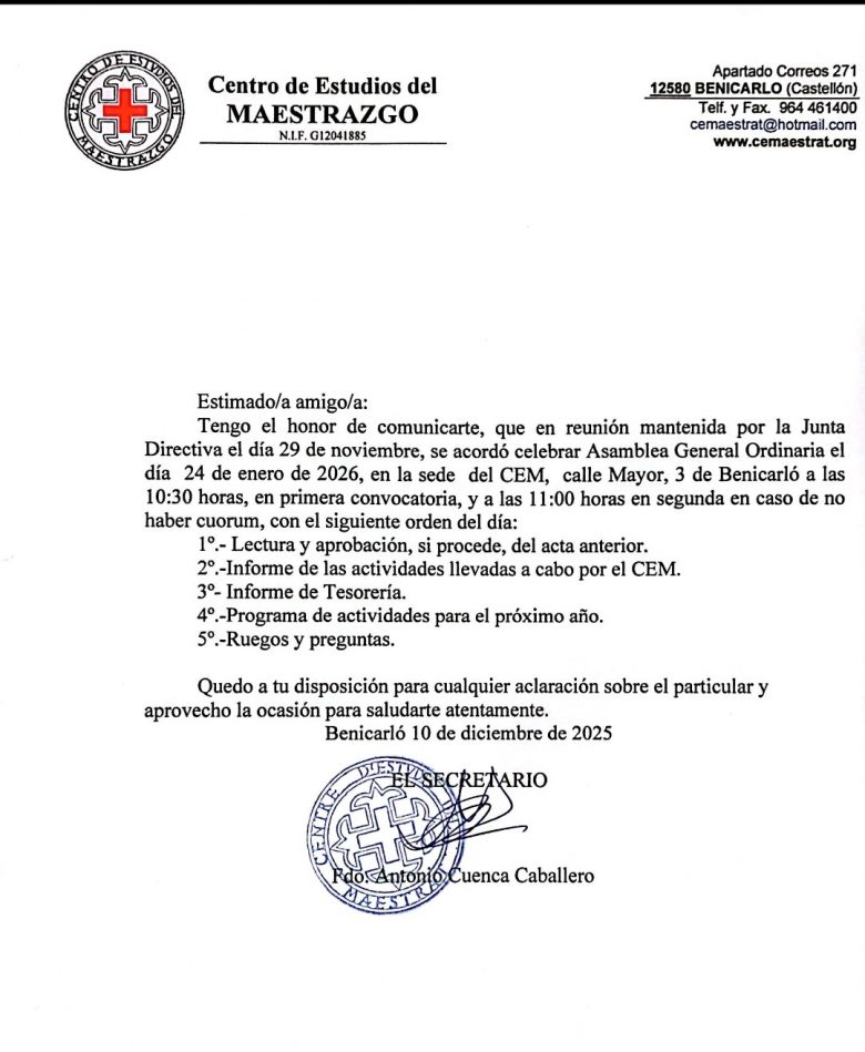 Benvolguts socis i sòcies. Us invitem a l’Assemblea General que se realitzarà en la seu del CEM, segons convocatòria adjunta, el dissabte 24 de gener de 2026.