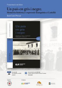 Benicarló acull el pròxim 29 de novembre a les 18:30 hores a la Sala de Premsa del MUCBE – Centre Cultural Convent de Sant Francesc, la presentació del llibre “Un país en gris i negre. Memòria històrica i repressió franquista a Castelló” una 4a ed. molt ampliada, per part de l’autor Juan Luis Porcar Orihuela i amb presentació de l’acte a càrrec de l’historiador i directiu de publicacions del CEM Narcís Tena Sales. Un acte organitzat pel Centre d’Estudis del Maestrat amb el qual l’autor Juan Luis Porcar ha col.laborat en diverses jornades i butlletins.